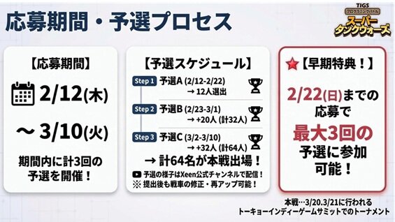 早期に戦車を応募すると、最大3回の予選で他の参加者と戦うことができます!